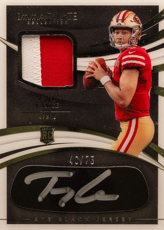 The Trey Lance 2021 Immaculate #REB-TRL Immaculate Rookie Eye Black Jersey Autographs (/75) card in Raw condition has not changed in price in the last 30 days and was last sold for $26.00 .
