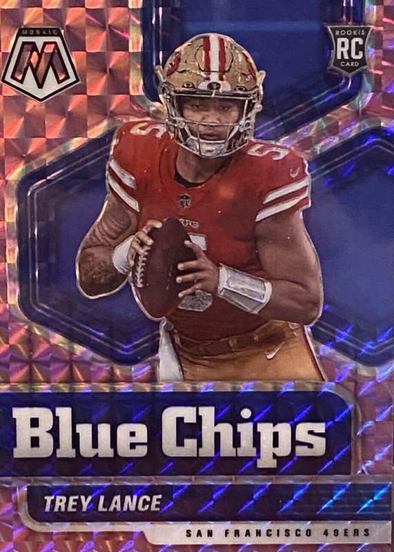 The Trey Lance 2021 Mosaic #3 Blue Chips - Purple /49 Rookie card in Raw condition has not changed in price in the last 30 days and was last sold for $20.50 .