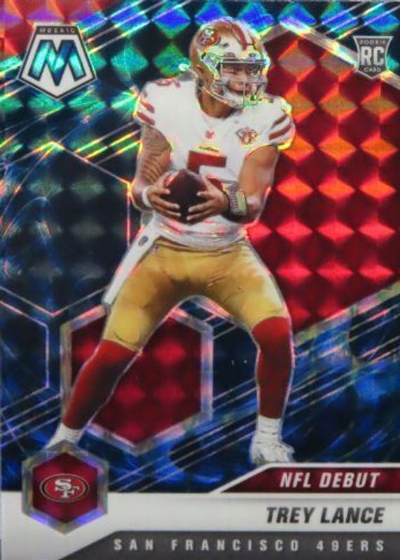 The Trey Lance 2021 Mosaic #244 NFL Debut - Genesis /(SSP) Rookie card in Raw condition has not changed in price in the last 30 days and was last sold for $15.99 .