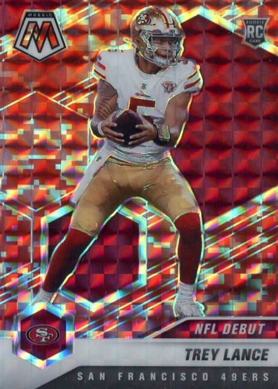 The Trey Lance 2021 Mosaic #244 NFL Debut - Red Camo Rookie card in Raw condition has not changed in price in the last 30 days and was last sold for $5.85 .