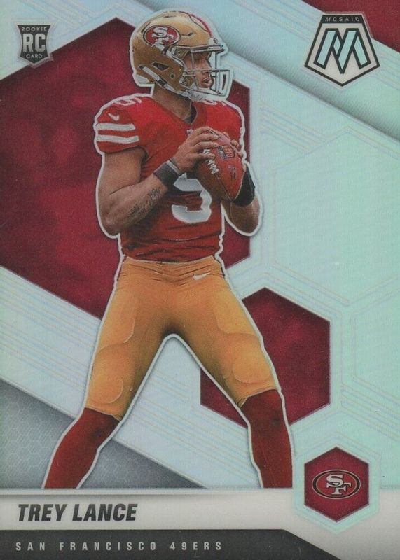 The Trey Lance 2021 Mosaic #303 Silver Rookie card in Raw condition has moved up $8.75 (+700%) in the last 30 days and was last sold for $10.00 .