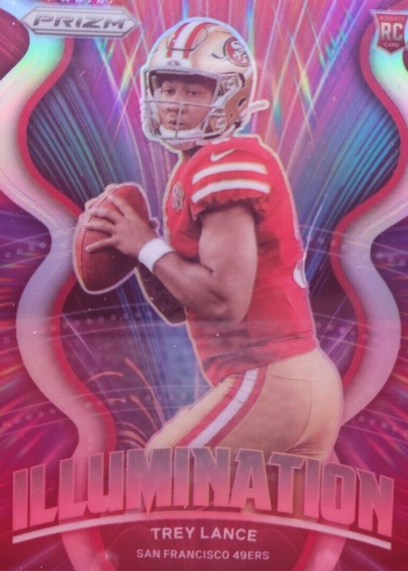 The Trey Lance 2021 Prizm #I-3 Illumination /(SSP) Rookie card in Raw condition has moved up $1.52 (+154%) in the last 30 days and was last sold for $2.51 .