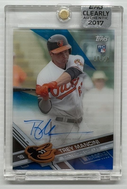 The Trey Mancini 2017 Clearly Authentic #CAAU-TM Blue /25 Rookie card is 1 of 5 Trey Mancini's card variations in the 2017 Clearly Authentic set being tracked by Sports Card Investor, including Base, Green /99, Red /50, and Gold /1.
