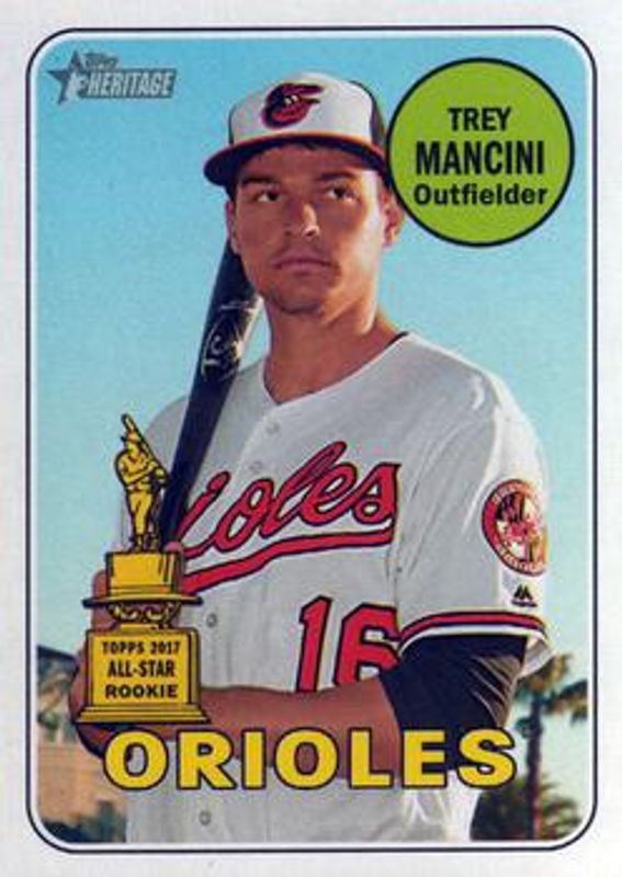 The Trey Mancini 2018 Topps Heritage #250 Base card is 1 of 15 Trey Mancini's card variations in the 2018 Topps Heritage set being tracked by Sports Card Investor, including Base, 100th Anniversary, Magenta Backs, Reverse Stock, and Mini /100.