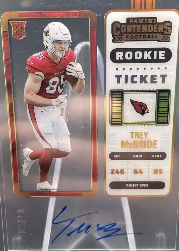 This card is 1 of 28 Trey McBride's card variations in the 2022 Contenders set being tracked by Sports Card Investor, including Rookie Ticket Auto, Rookie Ticket Auto - Red Zone Ticket, Rookie Ticket Auto - Silver (/99), Rookie Ticket Auto - Ticket Stub (/85), and Rookie Ticket Auto - Wild Card.