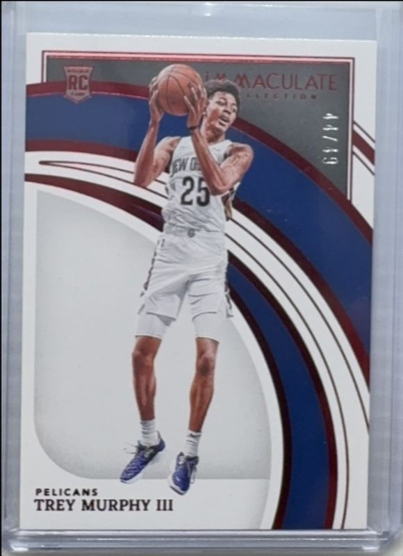 The Trey Murphy III 2021 Immaculate #64 Red /49 Rookie card is 1 of 38 Trey Murphy III's card variations in the 2021 Immaculate set being tracked by Sports Card Investor, including #64 Base /99, #113 Base /99, #113 Red /49, #64 Blue /25, and #113 Gold /10.