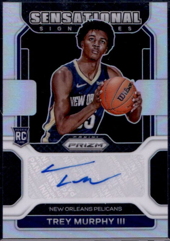 The Trey Murphy III 2021 Prizm #SS-TMU Sensational Signatures - Silver Rookie card is 1 of 96 Trey Murphy III's card variations in the 2021 Prizm set being tracked by Sports Card Investor, including Base, Blue NBA 75th Anniversary, Blue Wave, Choice Blue Yellow Green, and Factory Set Blue Hyper.