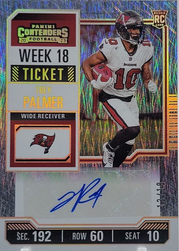 The Trey Palmer 2023 Contenders #263 Rookie Ticket Auto - Week 18 /18 card in Raw condition has not changed in price in the last 30 days and was last sold for $59.00 .
