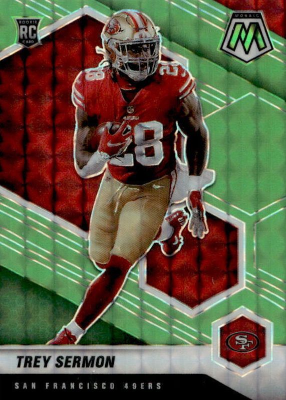 The Trey Sermon 2021 Mosaic #324 Green Fluorescent /10 Rookie card in Raw condition has not changed in price in the last 30 days and was last sold for $4.44 .