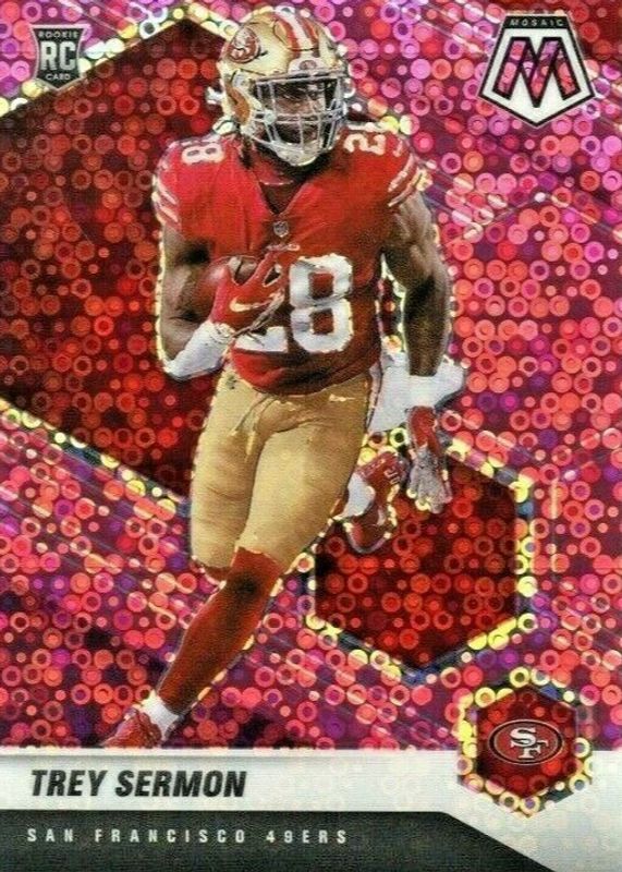The Trey Sermon 2021 Mosaic #324 No Huddle Pink /20 Rookie card in Raw condition has not changed in price in the last 30 days and was last sold for $30.00 .