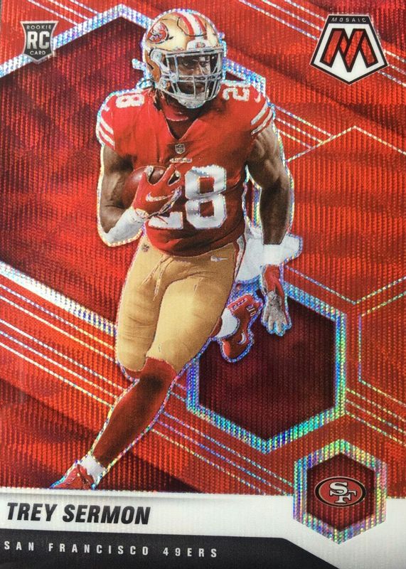The Trey Sermon 2021 Mosaic #324 Red Wave /9 Rookie card in Raw condition has not changed in price in the last 30 days and was last sold for $75.00 .