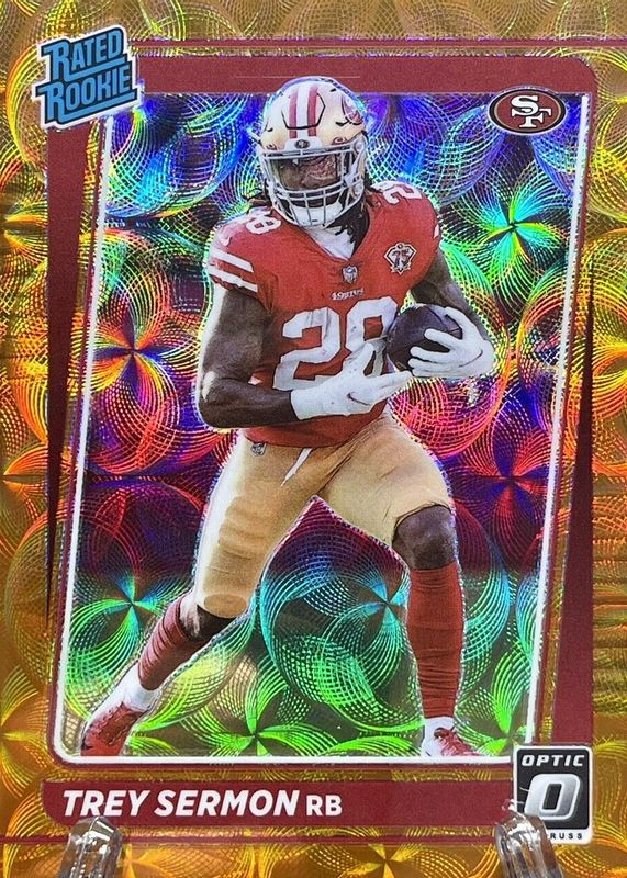The Trey Sermon 2021 Optic #224 Orange Scope /79 Rookie card in Raw condition has not changed in price in the last 30 days and was last sold for $6.89 .