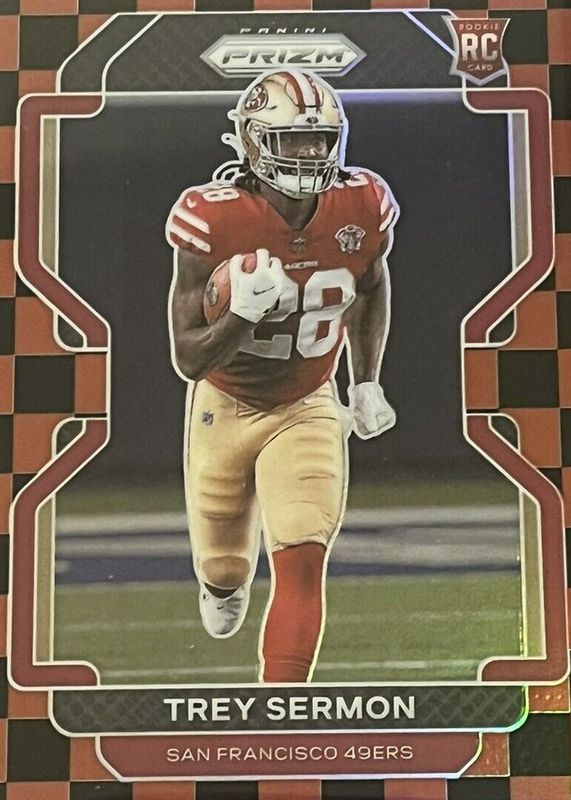 The Trey Sermon 2021 Prizm #354 Black & Red Checker /(SSP) Rookie card in Raw condition has not changed in price in the last 30 days and was last sold for $12.04 .