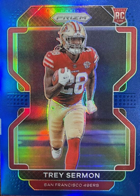 The Trey Sermon 2021 Prizm #354 Blue /(SSP) Rookie card in Raw condition has not changed in price in the last 30 days and was last sold for $19.99 .