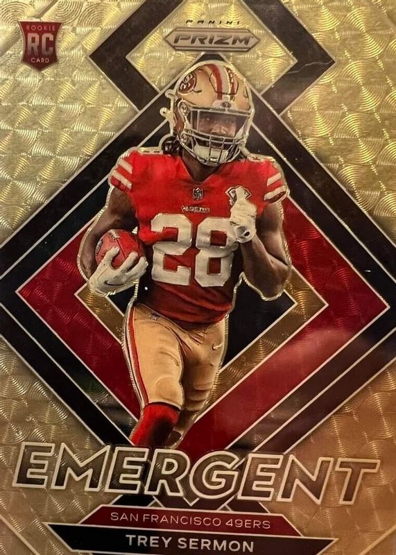 The Trey Sermon 2021 Prizm #E-19 Emergent - Gold Vinyl /5 Rookie card in Raw condition has not changed in price in the last 30 days and was last sold for $30.00 .