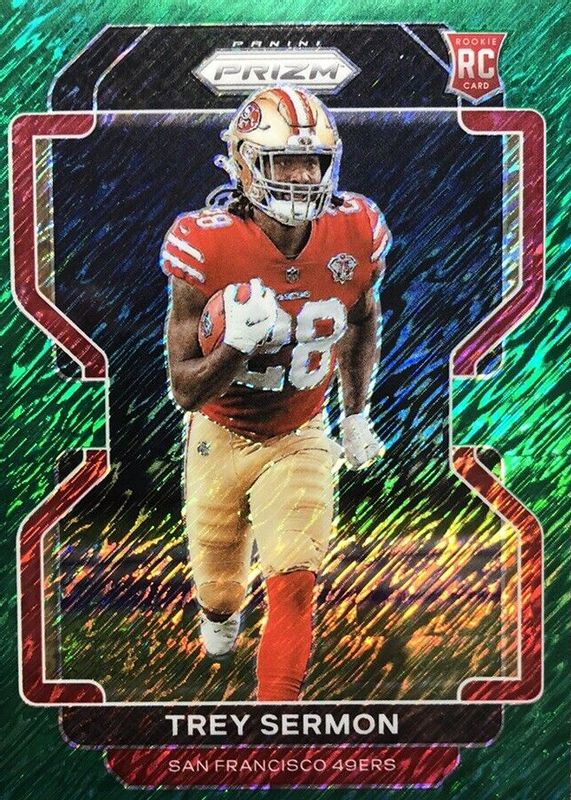 The Trey Sermon 2021 Prizm #354 FOTL Green Shimmer /5 Rookie card in Raw condition has not changed in price in the last 30 days and was last sold for $13.66 .