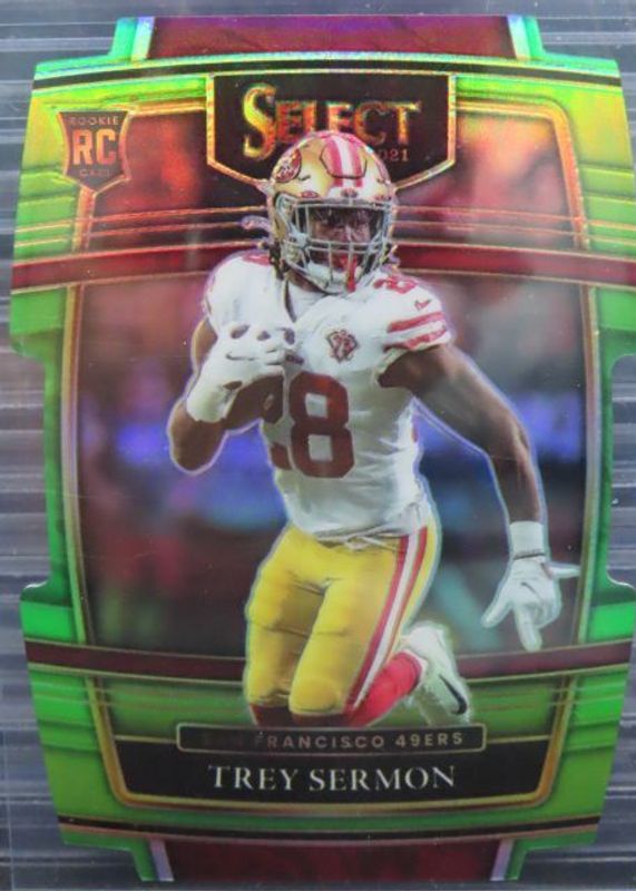 The Trey Sermon 2021 Select #68 Concourse Neon Green Die-Cut /349 Rookie card in Raw condition has not changed in price in the last 30 days and was last sold for $7.85 .