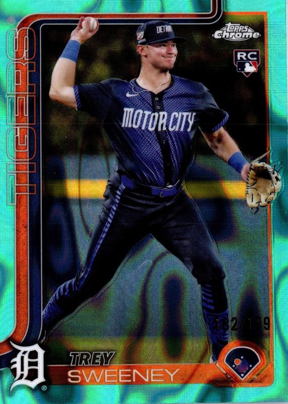 The Trey Sweeney 2025 Topps Chrome #6 Aqua Lava Refractor /199 Rookie card in Raw condition has not changed in price in the last 30 days and was last sold for $4.99 .