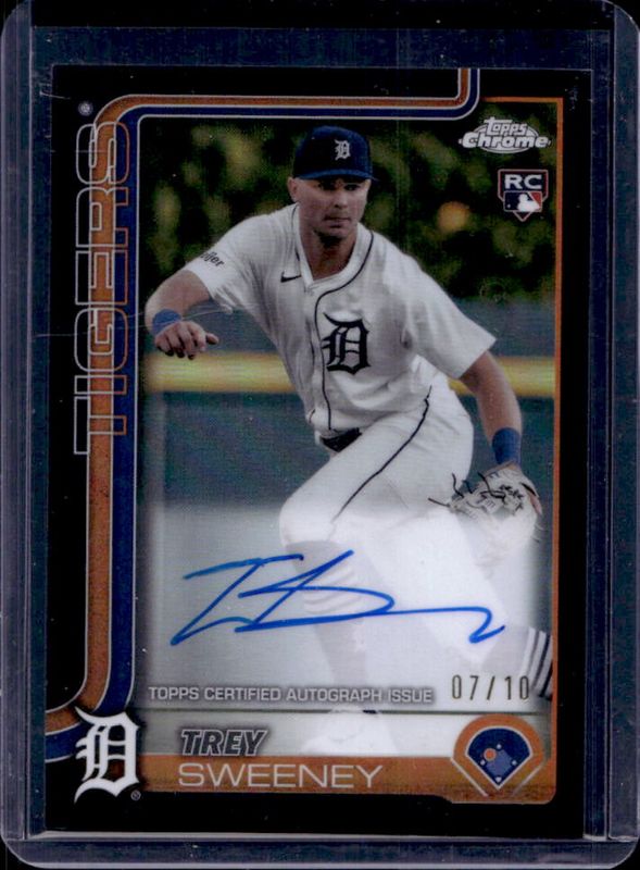 The Trey Sweeney 2025 Topps Chrome #RA-TS Rookie Autographs - Black Refractor /10 card is 1 of 72 Trey Sweeney's card variations in the 2025 Topps Chrome set being tracked by Sports Card Investor, including Base, Geometric Refractor, Lightboard Logo Variation, Negative Refractor, and Prism Refractor.