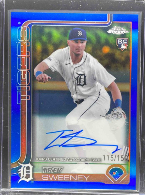 The Trey Sweeney 2025 Topps Chrome #RA-TS Rookie Autographs - Blue Refractor /150 card is 1 of 72 Trey Sweeney's card variations in the 2025 Topps Chrome set being tracked by Sports Card Investor, including Base, Geometric Refractor, Lightboard Logo Variation, Negative Refractor, and Prism Refractor.