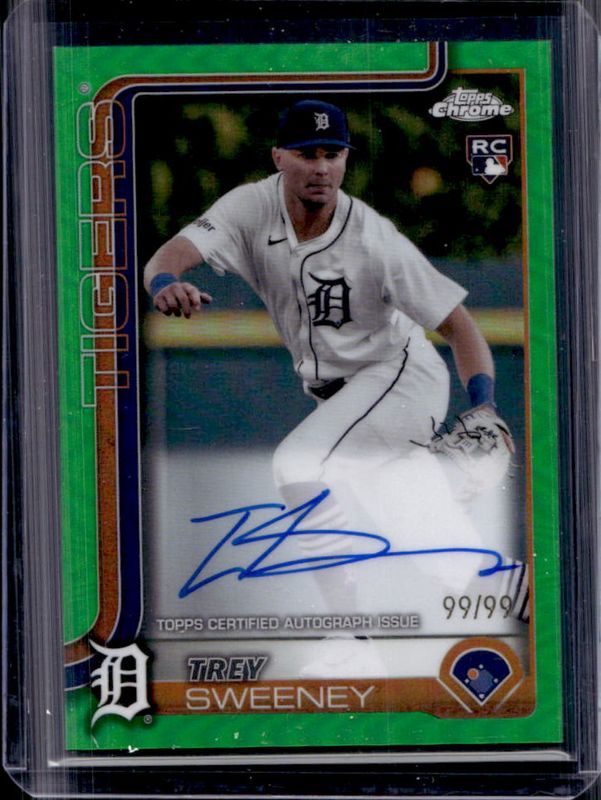 The Trey Sweeney 2025 Topps Chrome #RA-TS Rookie Autographs - Green Refractor /99 card is 1 of 72 Trey Sweeney's card variations in the 2025 Topps Chrome set being tracked by Sports Card Investor, including Base, Geometric Refractor, Lightboard Logo Variation, Negative Refractor, and Prism Refractor.
