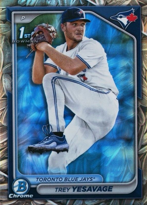 This card is 1 of 50 Trey Yesavage's card variations in the 2024 Bowman Draft set being tracked by Sports Card Investor, including Chrome (1st), Chrome - Bubble Gum (1st), Chrome - Lunar Glow Refractor (1st), Chrome - Peanuts (1st), and Chrome - Pearl Refractor (1st).