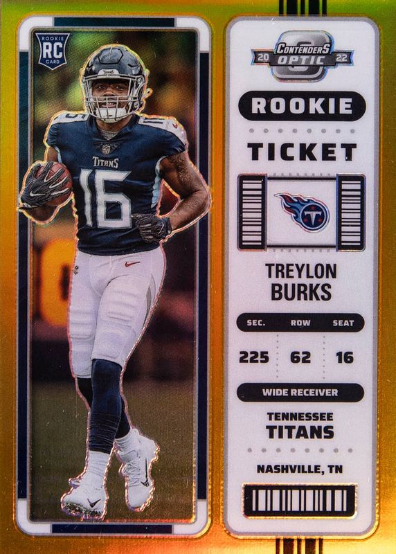 The Treylon Burks 2022 Contenders Optic #94 Gold /10 Rookie card in Raw condition has not changed in price in the last 30 days and was last sold for $44.00 .