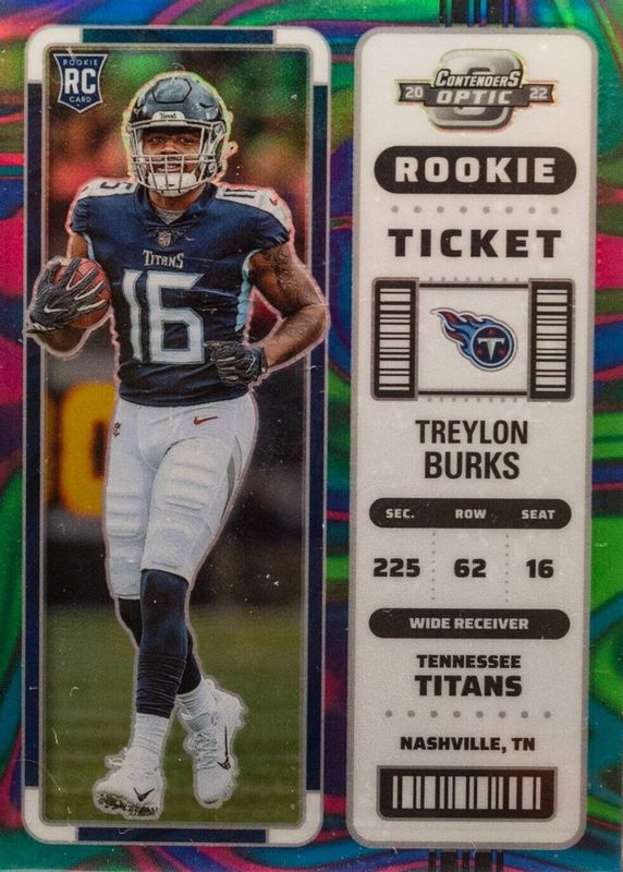 The Treylon Burks 2022 Contenders Optic #94 Neon Marble /4 Rookie card in Raw condition has not changed in price in the last 30 days and was last sold for $117.50 .