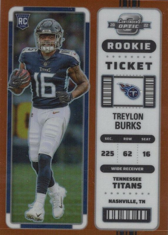 The Treylon Burks 2022 Contenders Optic #94 Orange /50 Rookie card in Raw condition has not changed in price in the last 30 days and was last sold for $6.00 .