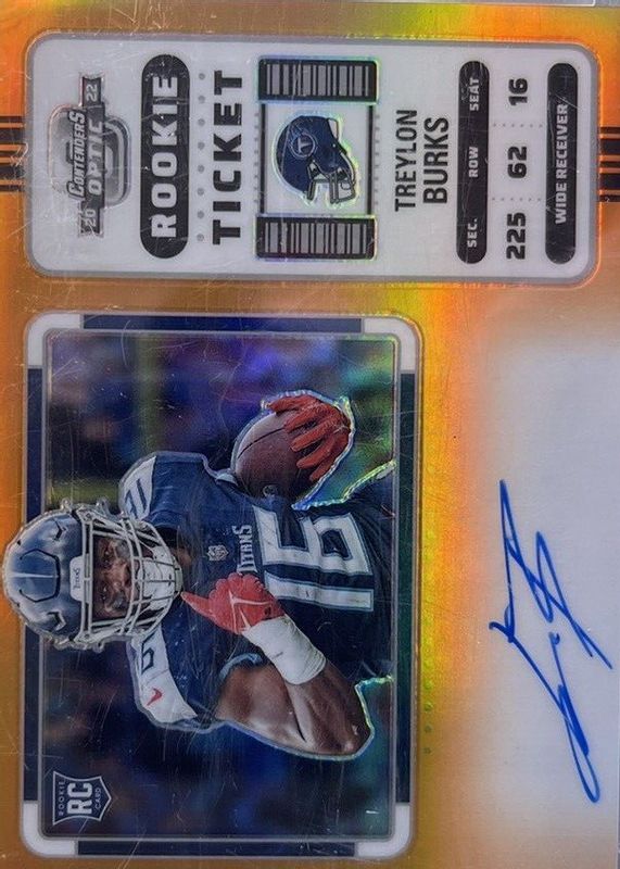 The Treylon Burks 2022 Contenders Optic #137 Rookie Ticket Auto Variation - Orange /20 card in Raw condition has not changed in price in the last 30 days and was last sold for $80.00 .