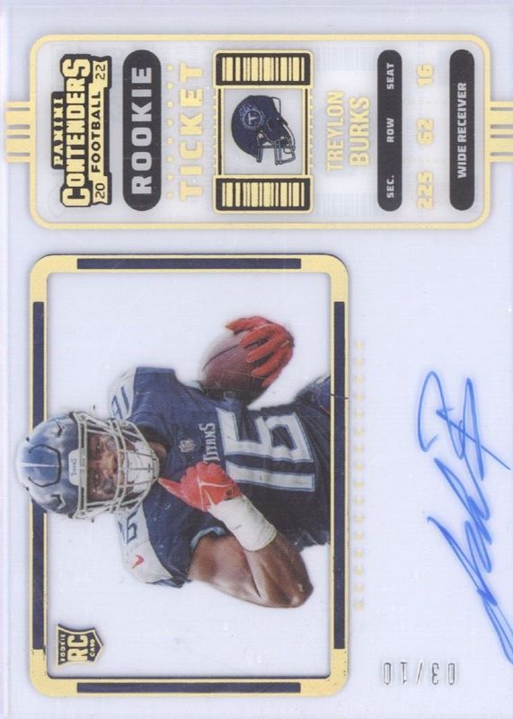 The Treylon Burks 2022 Contenders #137 Rookie Ticket Auto Variation - Clear Ticket /10 card in Raw condition has not changed in price in the last 30 days and was last sold for $119.50 .