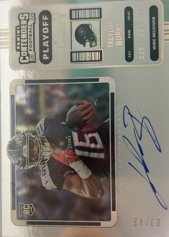 The Treylon Burks 2022 Contenders #137 Rookie Ticket Auto Variation - Playoff Ticket /49 card in Raw condition has not changed in price in the last 30 days and was last sold for $14.00 .