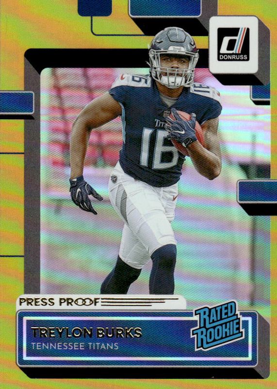 The Treylon Burks 2022 Donruss #312 Press Proof Premium Rookie card in Raw condition has not changed in price in the last 30 days and was last sold for $0.99 .