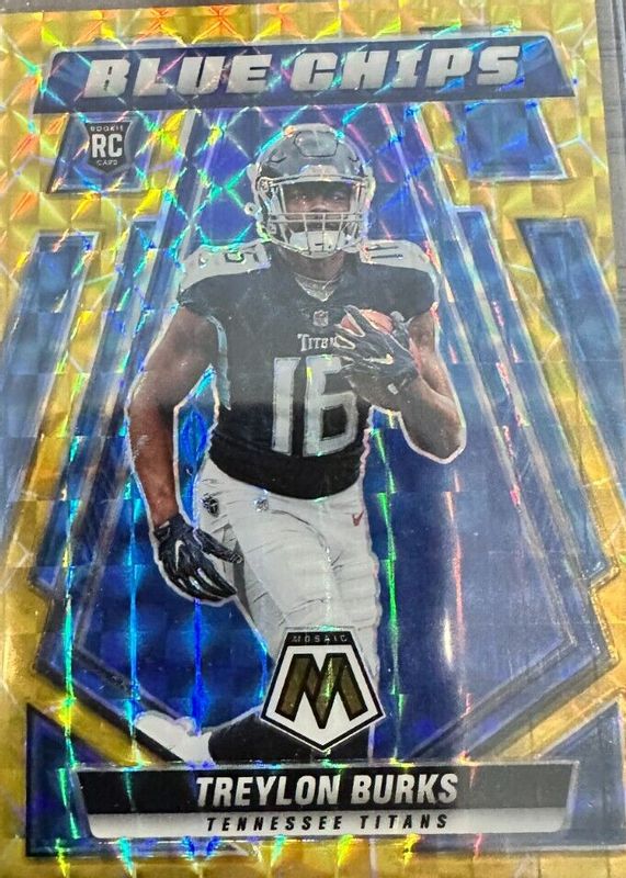 The Treylon Burks 2022 Mosaic #BC-10 Blue Chips - Gold /10 Rookie card in Raw condition has not changed in price in the last 30 days and was last sold for $8.00 .