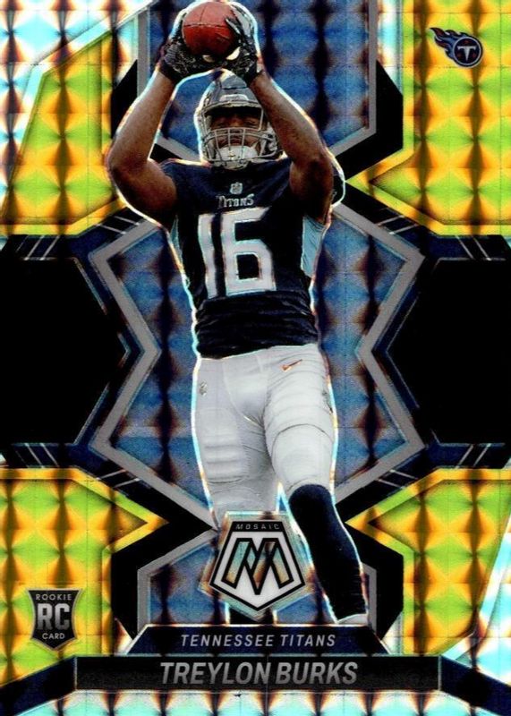 The Treylon Burks 2022 Mosaic #315 Choice Black Gold /8 Rookie card in Raw condition has not changed in price in the last 30 days and was last sold for $122.49 .