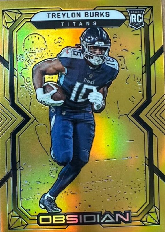 The Treylon Burks 2022 Obsidian #115 Electric Etch Gold Flood /10 Rookie card in Raw condition has not changed in price in the last 30 days and was last sold for $40.00 .
