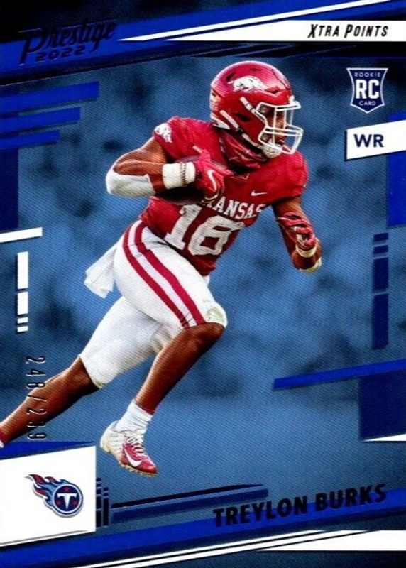The Treylon Burks 2022 Prestige #316 Xtra Points Blue /299 Rookie card in Raw condition has not changed in price in the last 30 days and was last sold for $0.99 .