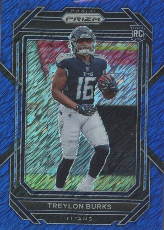 The Treylon Burks 2022 Prizm #313 Blue Shimmer /25 Rookie card in Raw condition has not changed in price in the last 30 days and was last sold for $6.50 .