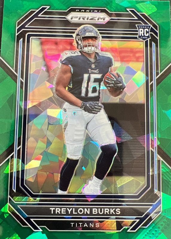 The Treylon Burks 2022 Prizm #313 Green Ice Rookie card in Raw condition has not changed in price in the last 30 days and was last sold for $8.00 .