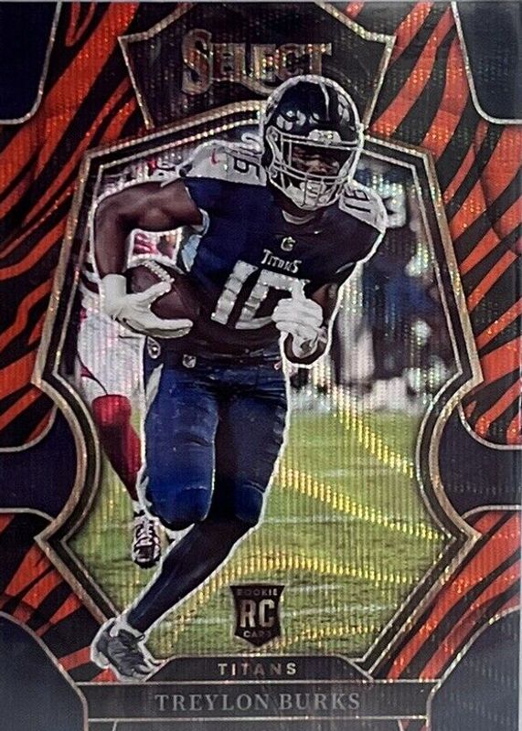 The Treylon Burks 2022 Select #195 Premier Level Tiger /(SSP) Rookie card in Raw condition has not changed in price in the last 30 days and was last sold for $27.00 .