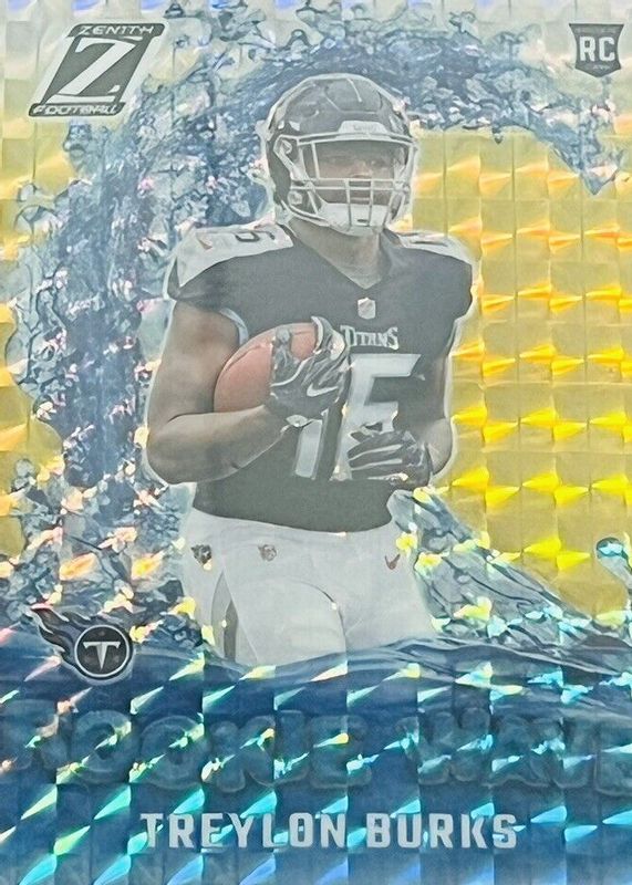 This card is 1 of 27 Treylon Burks' card variations in the 2022 Zenith set being tracked by Sports Card Investor, including Base, No Huddle, Red Zone, Retail, and 1st Down /100.