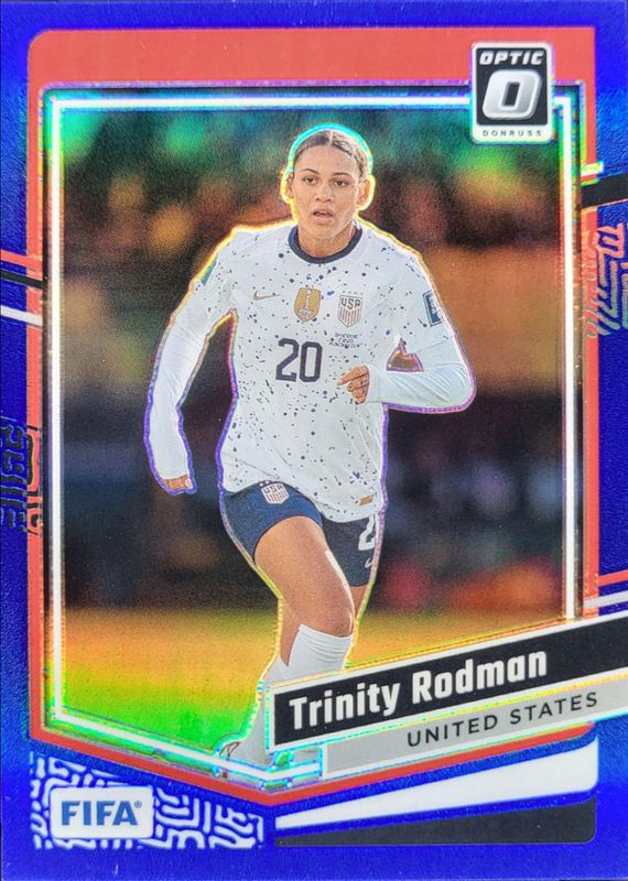 The Trinity Rodman 2023 Donruss #67 Optic - Blue /99 card is 1 of 30 Trinity Rodman's card variations in the 2023 Donruss set being tracked by Sports Card Investor, including Base, Optic, Cubic, Diamond, and Optic - Argyle.