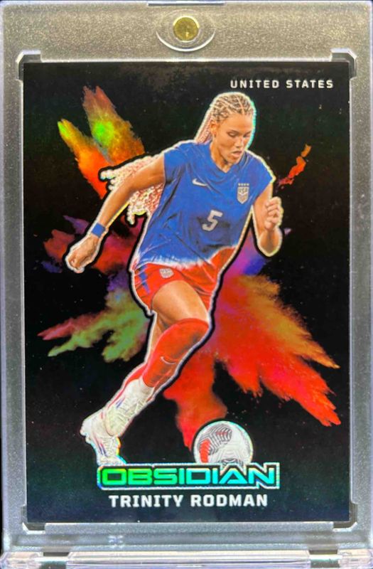 The Trinity Rodman 2024 Obsidian #1 Color Blast - Black card is 1 of 36 Trinity Rodman's card variations in the 2024 Obsidian set being tracked by Sports Card Investor, including Base /145, Electric Etch Red Pulsar /44, Electric Etch Orange /40, Electric Etch Purple Flood /30, and Electric Etch Imperial Jade /26.