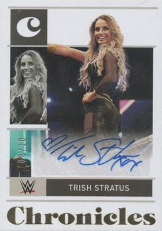 The Trish Stratus 2022 Chronicles WWE #CS-TST Chronicles Signatures - Gold /10 card is 1 of 38 Trish Stratus' card variations in the 2022 Chronicles WWE set being tracked by Sports Card Investor, including #323 Base /99, #335 Base /99, #192 Base /99, #335 Bronze, and #192 Bronze.