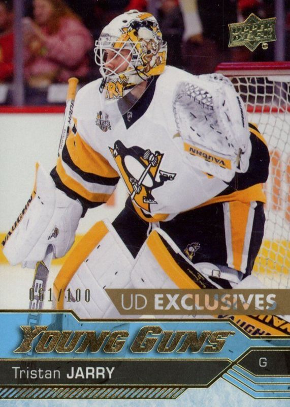 This card is 1 of 8 Tristan Jarry's card variations in the 2016 Upper Deck set being tracked by Sports Card Investor, including Young Guns Base, Young Guns - Clear Cut, Young Guns - Gold Rainbow Foil, Young Guns - Jumbo, and Young Guns - Silver Foil.