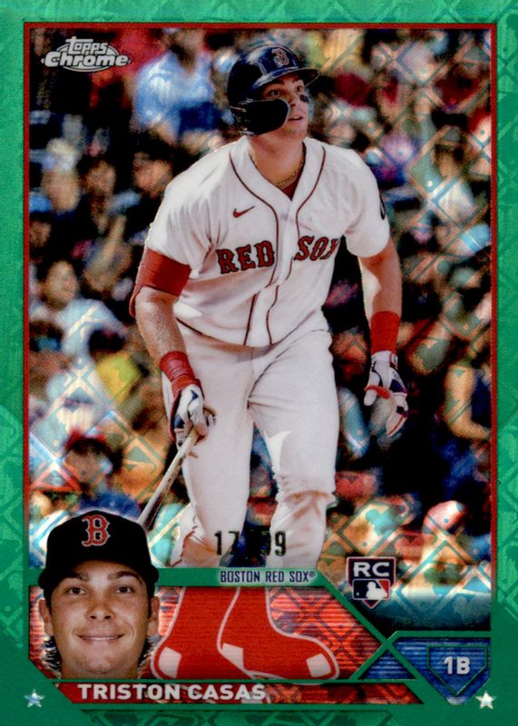 The Triston Casas 2023 Topps Chrome Logofractor Edition #174 Green /99 Rookie card in Raw condition has not changed in price in the last 30 days and was last sold for $8.00 .