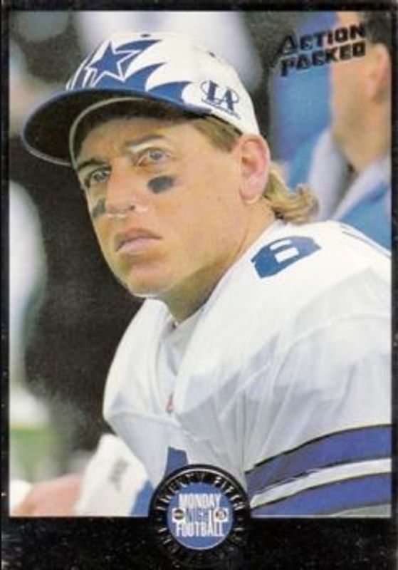 The Troy Aikman 1994 Action Packed Monday Night Football #54 Base card is 1 of 2 Troy Aikman's card variations in the 1994 Action Packed Monday Night Football set being tracked by Sports Card Investor, including Silver.