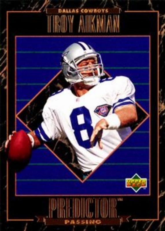 The Troy Aikman 1995 Upper Deck #RP4 Predictors: League Leaders card is 1 of 10 Troy Aikman's card variations in the 1995 Upper Deck set being tracked by Sports Card Investor, including Base, Electric, Electric Gold, Predictors: Award Winners, and Predictors Exchange: Award Winners.