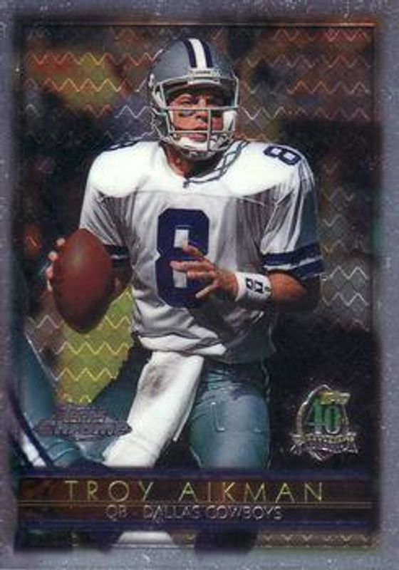 The Troy Aikman 1996 Topps Chrome #1 Base card is 1 of 7 Troy Aikman's card variations in the 1996 Topps Chrome set being tracked by Sports Card Investor, including #137 Base, #137 3,000 Yard Club - Refractor, #137 Refractor, #1 Refractor, and #36 40th Anniversary Retros.