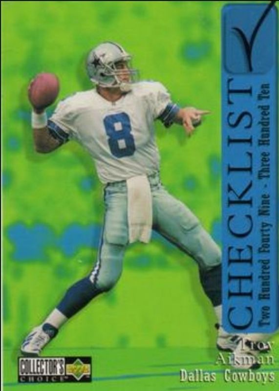 The Troy Aikman 1997 Upper Deck Collector's Choice #309 Base card is 1 of 16 Troy Aikman's card variations in the 1997 Upper Deck Collector's Choice set being tracked by Sports Card Investor, including #450 Base, #563 Base, #60 Base, #1 Jumbos 3x5, and #8 Memorable Moments.